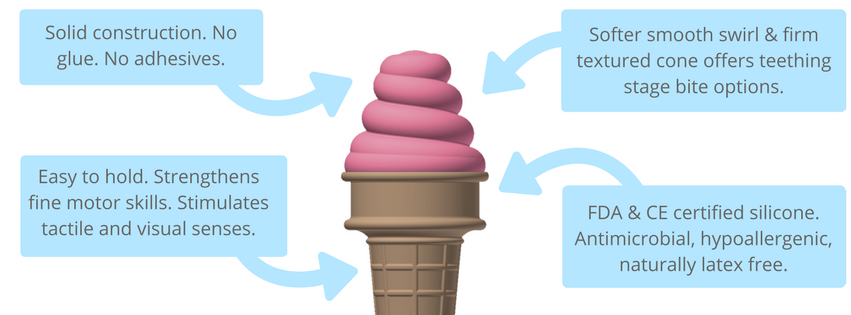 Softer smoother swirl and firm textured cone offers teething stage bite options. FDA and CE certified silicone. Antimicrobial, hypoallergenic, naturally latex free. Made from 100% silicone that surpasses safety standards in the US, Canada, and Europe. No BPA, PVC, or Phthalates. Guaranteed. With SweeTooth you never need to worry about chemicals and toxins.