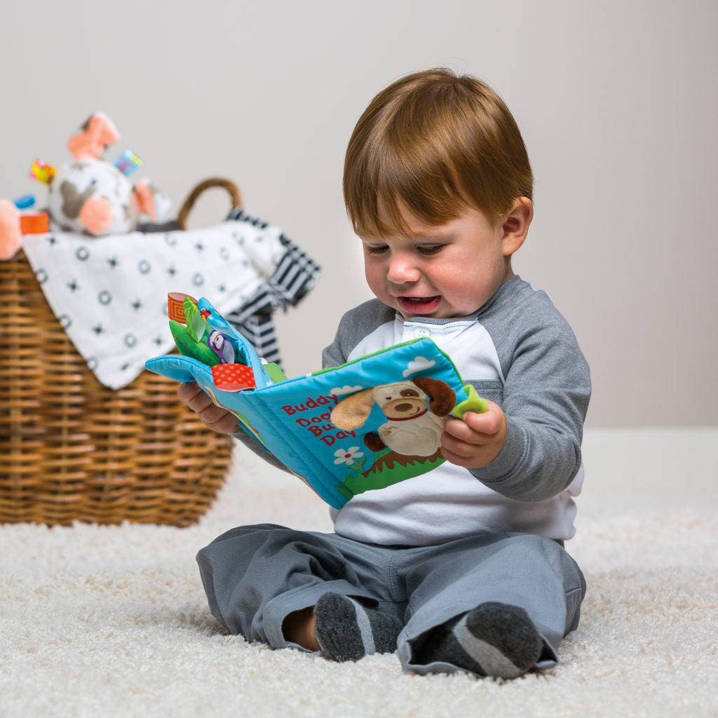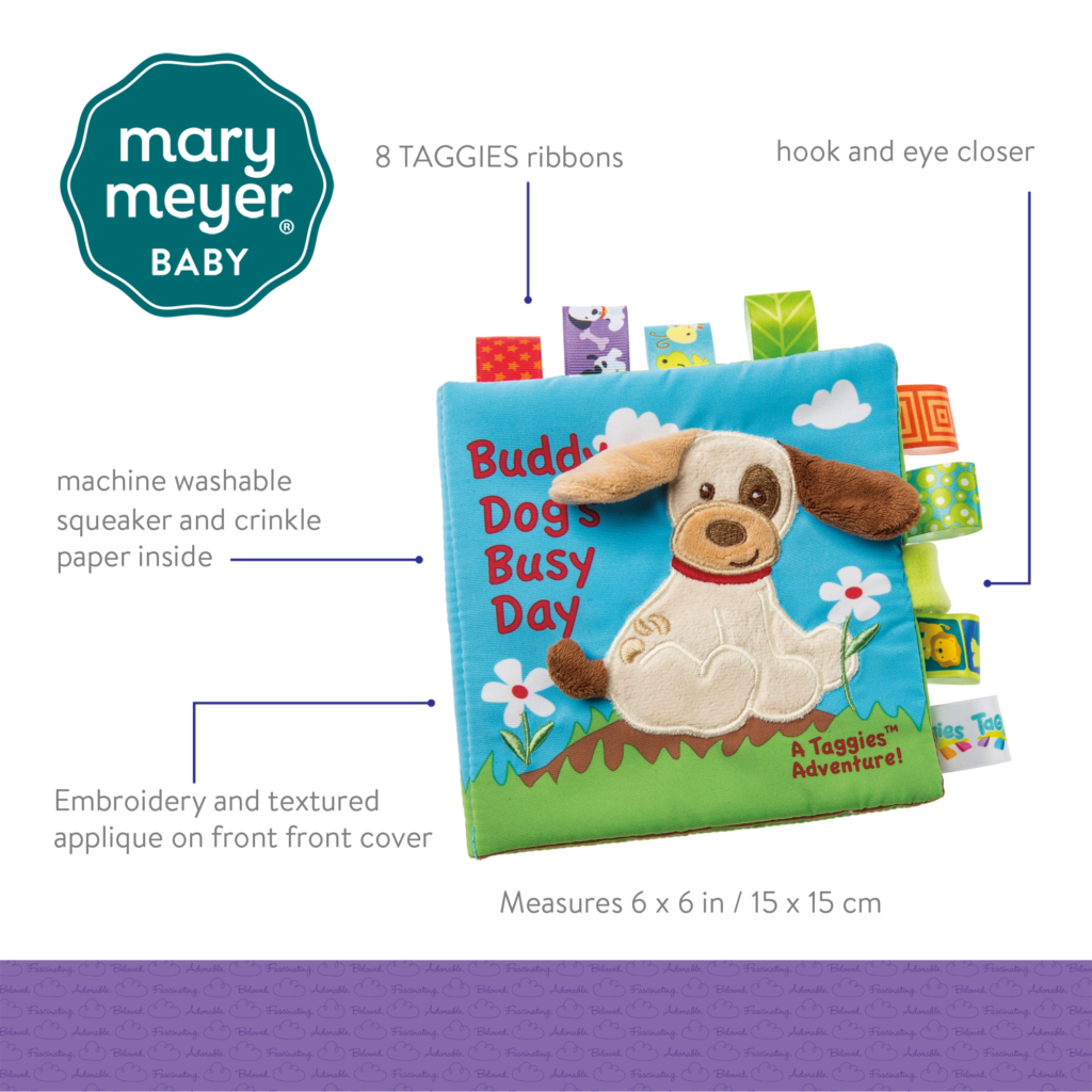 Taggies books are winning awards for their combination of stimulation (squeaker and crinkle paper inside) and soothing features (eight Taggies ribbons and textured fabric covers). Each book tells a short, sweet story in eight pages with hook fastener closure.