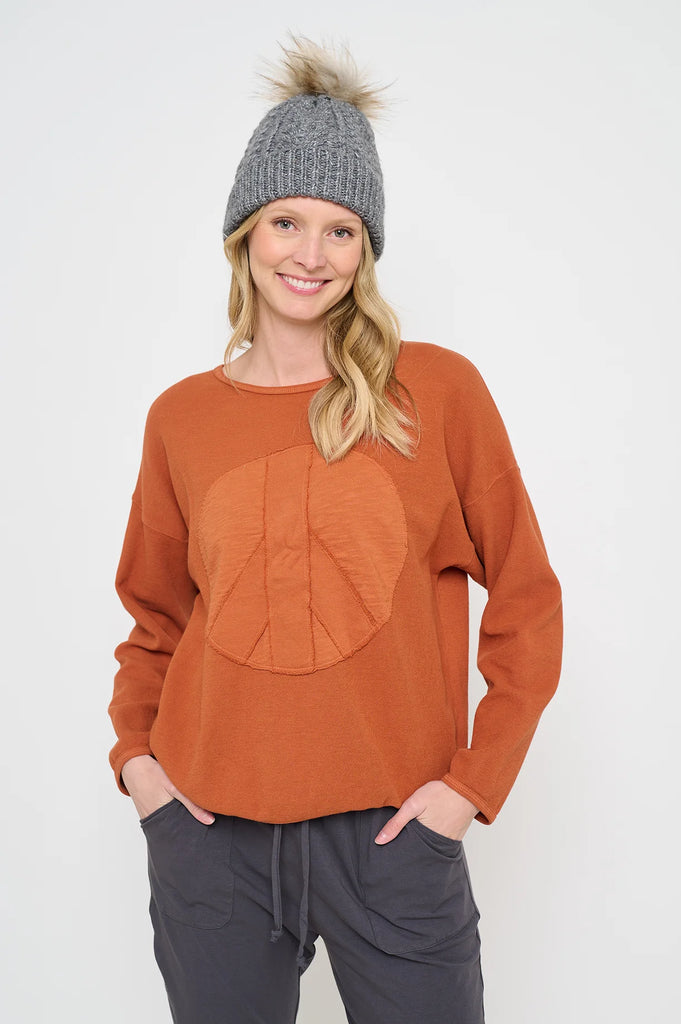 A round neckline and dropped shoulders further relax an easygoing sweatshirt cut from soft cotton in a comfortably oversized fit. Finished with long sleeves, a banded hemline and a frayed peace sign appliqué complete the sporty look.