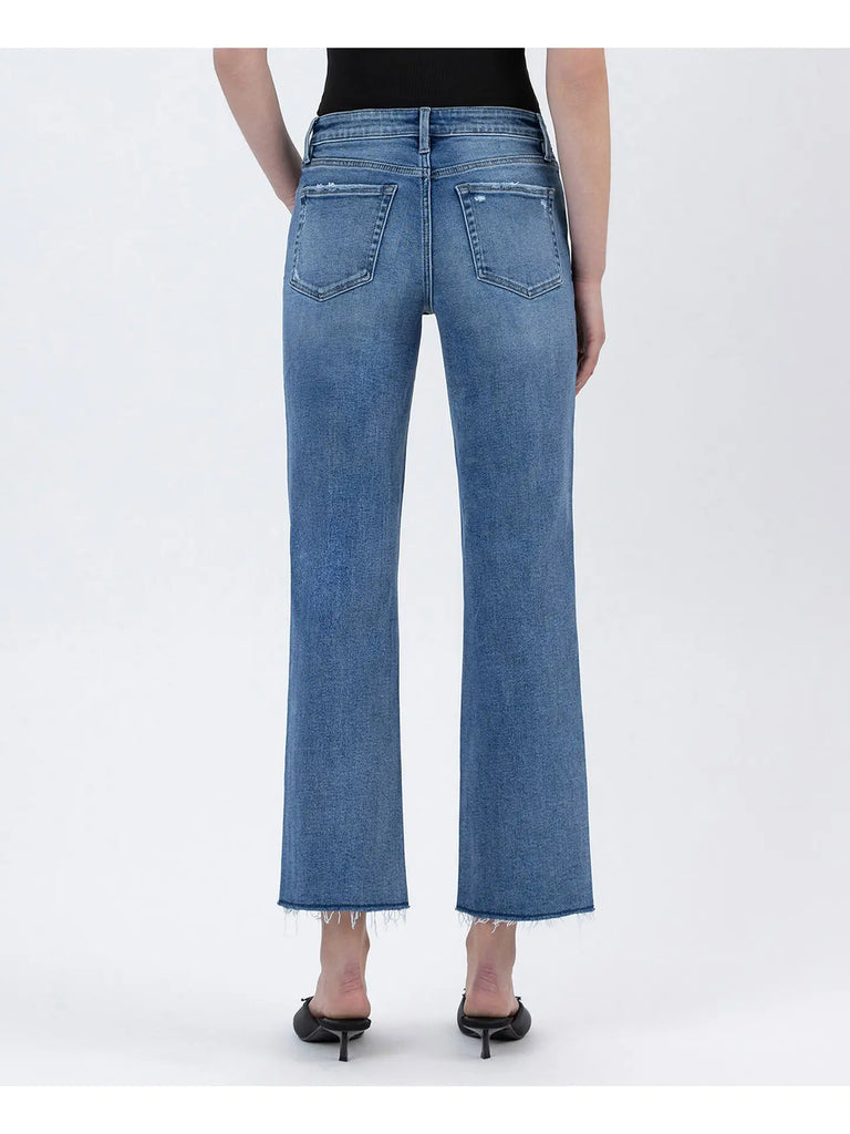 Comfort stretch denim, high rise waist, 5 pockets, lightly distressed detail, raw hem, ankle length, medium dark wash, straight jeans