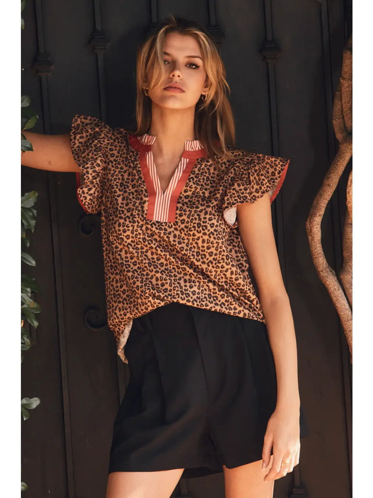 Leopard printed blouse with contrast stripe placket and ruffle cap sleeves.