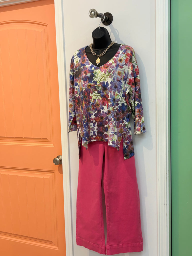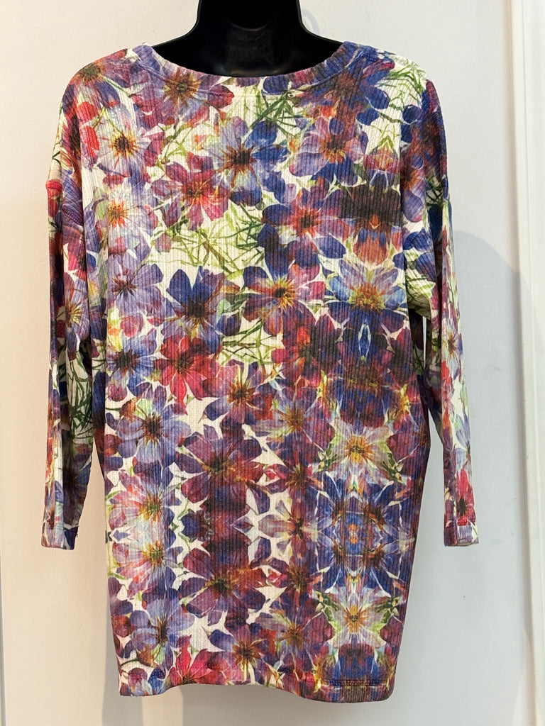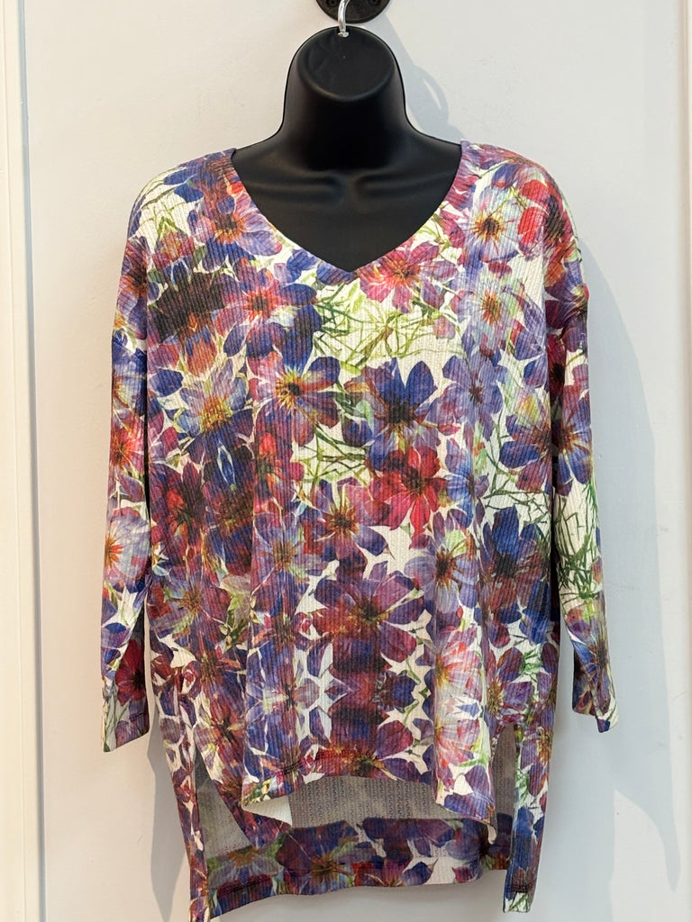 Purple Floral V Neck waffle long sleeve top. High Low hem with notch slits on the sides Beautiful floral pattern.