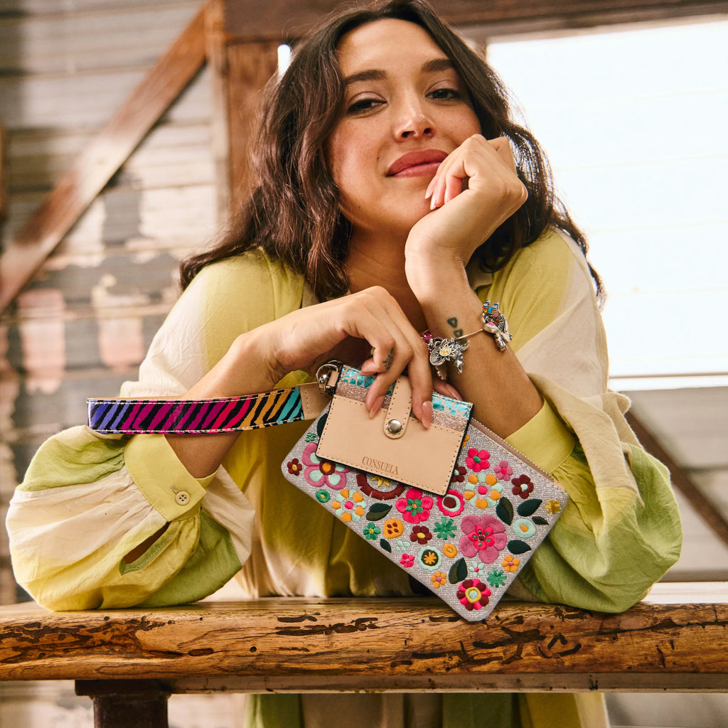The Combi, a combination of on-the-go accessories, is a new way to carry your keys, cards, and the small stuff together or separately. This embroidered wristlet wallet includes a pocket pouch, secure card slot wallet and fits comfortably around your wrist.