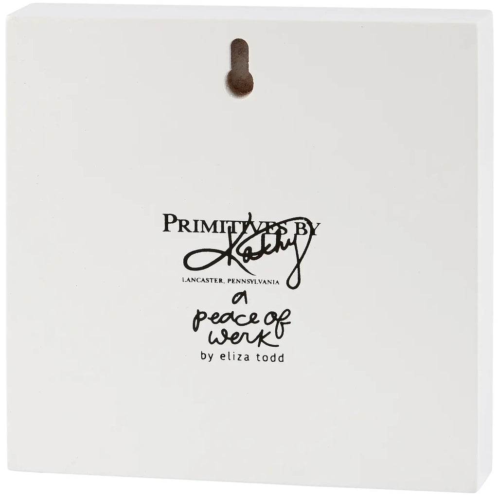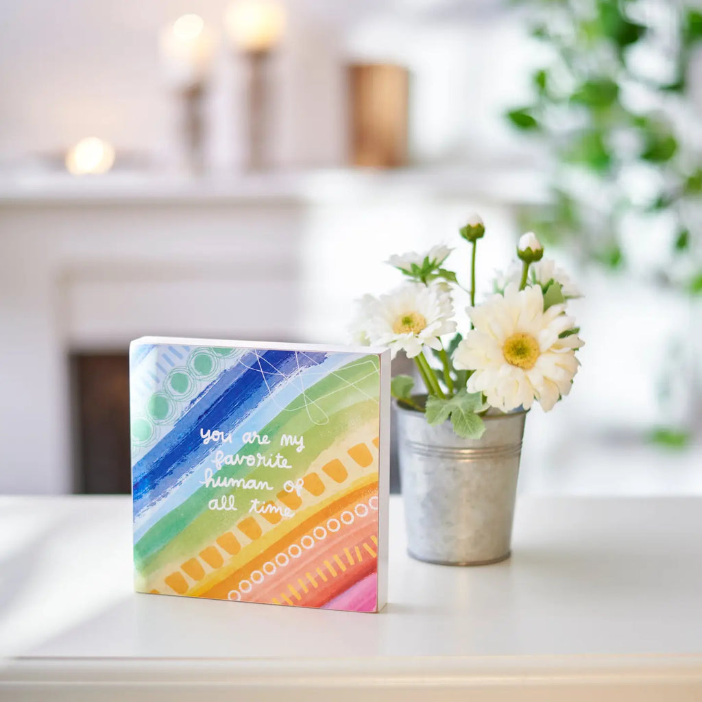 A wooden block sign displaying a hand illustrated abstract design in a warm color palette behind a heartwarming sentiment that reads "You Are My Favorite Human Of All Time." Block sign features coordinating white color on the sides and back. Our You Are My Favorite Human block sign is easy to hang via predrilled keyhole slot or can free-stand alone. A lovely gift perfect for an everyday home accent.