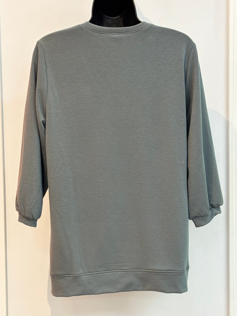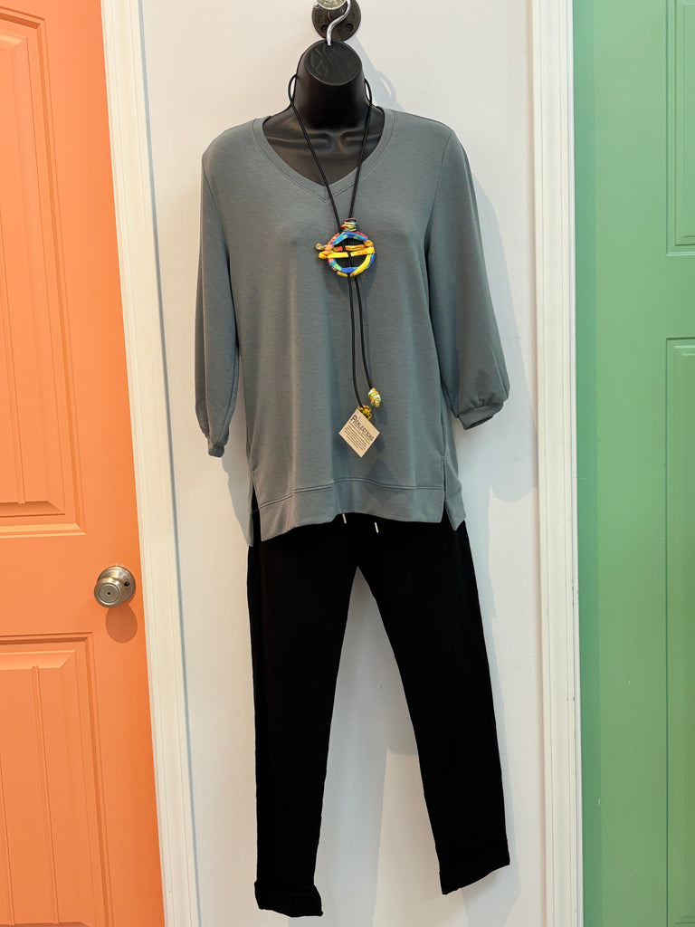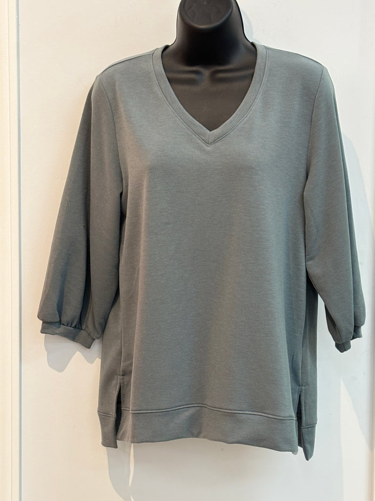 V neck Pine top with banded balloon elbow length sleeves and banded, notched bottom detail.