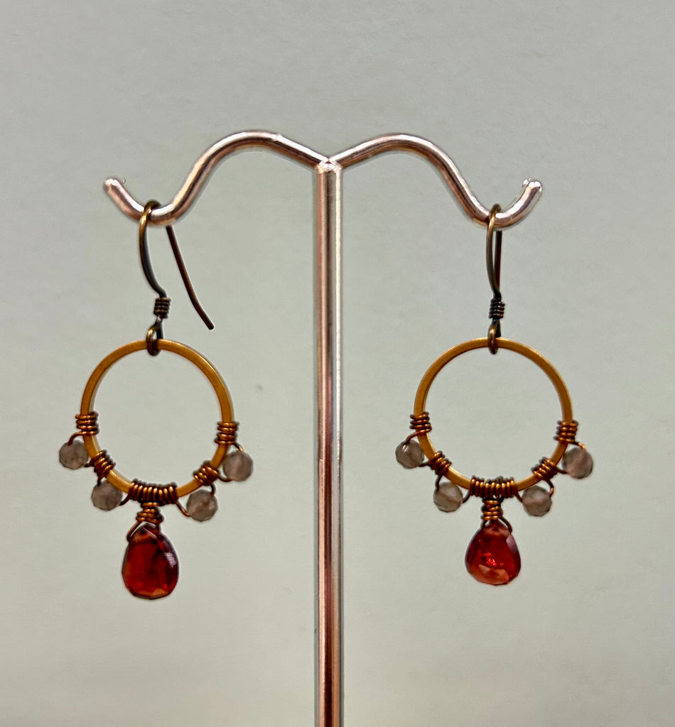 Smoky quartz with garnet wire wrapped hoop earrings.