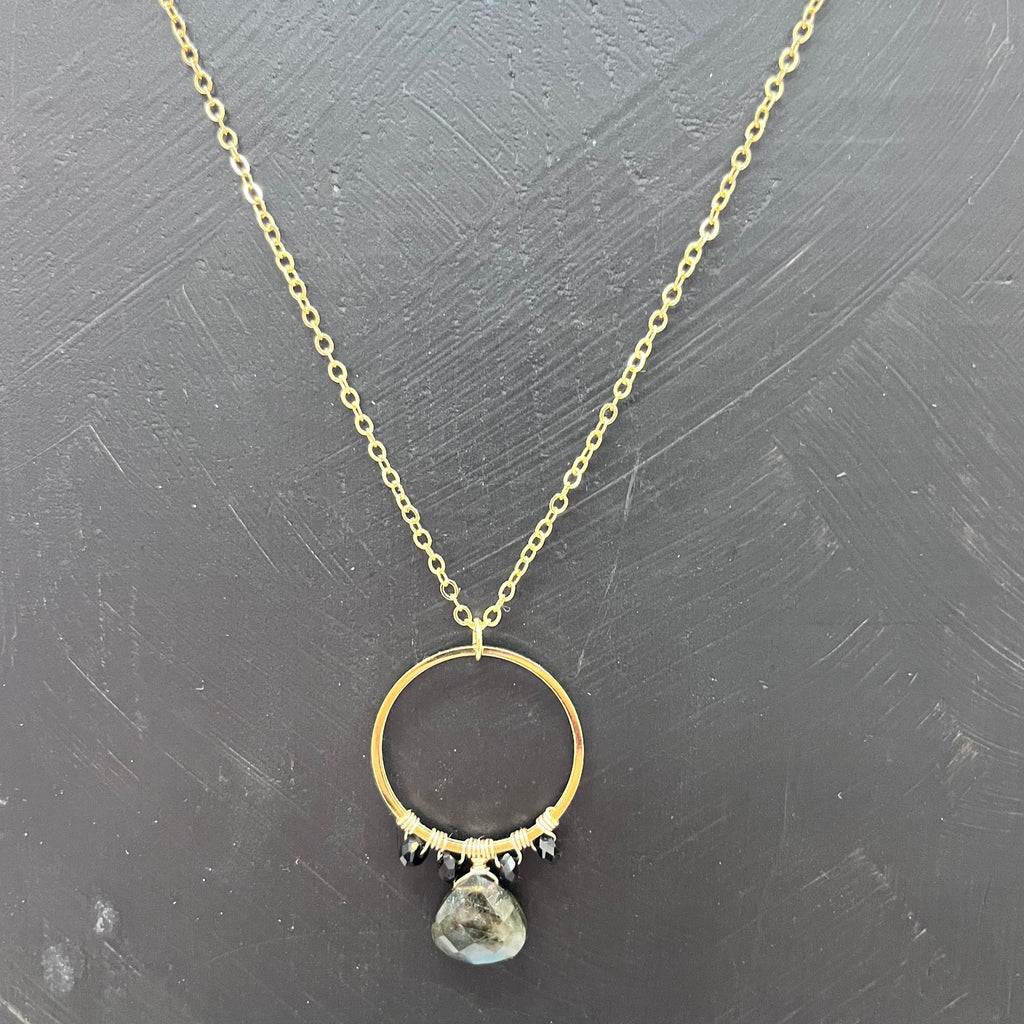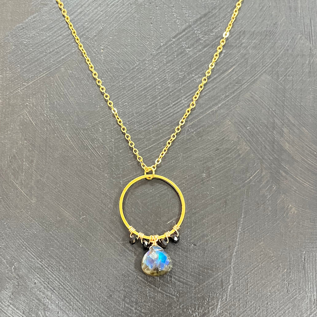 This charming necklace features a captivating labradorite crystal accented with black onyx and gold-plated for added elegance. It's a unique piece that perfectly embodies our creative use of energizing gold. Ideal for natural beauties everywhere, it's a transformative piece that enhances any look with a touch of unique charm.