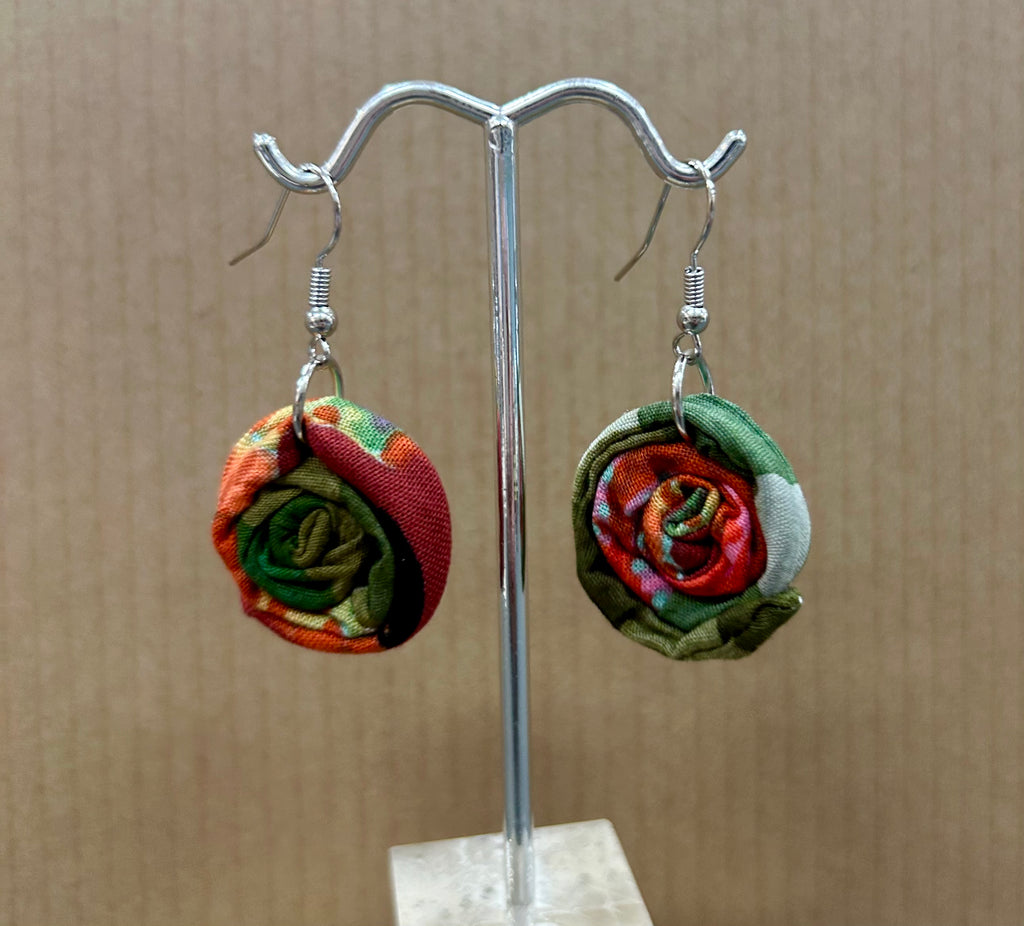 These 2-color fabric Millefiori medallions are rolled into tiny ‘cinnamon rolls’ and hang from stainless steel hooks. Each pair of medallions are made in reverse colors for fun, and the wire inside helps these earrings hold their shape! Comes carded with rubber stoppers.