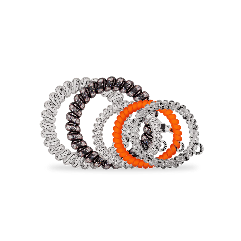 Hold your hair in place with ease and style!Mummy Knows Best Mix Pack Hair Tiesin Black and Orange offer a strong grip without damage, doubling as a stylish bracelet when not in use. Your new favorite hair essentials all year round.