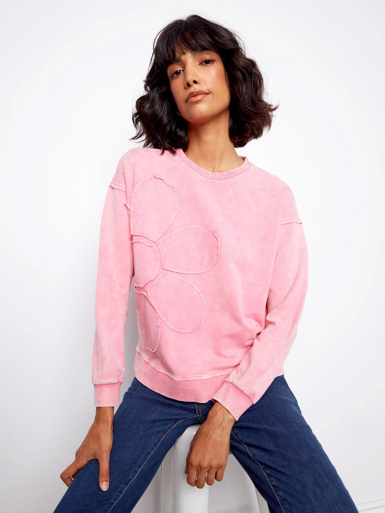 Embrace effortless style with our long sleeve candy pink top, featuring a charming flower applique on the front. Designed with a classic crew neckline, drop shoulders, and ribbed neck and cuffs, this top offers a comfortable fit. Crafted from stretchy cotton, it moves with you for all day ease.