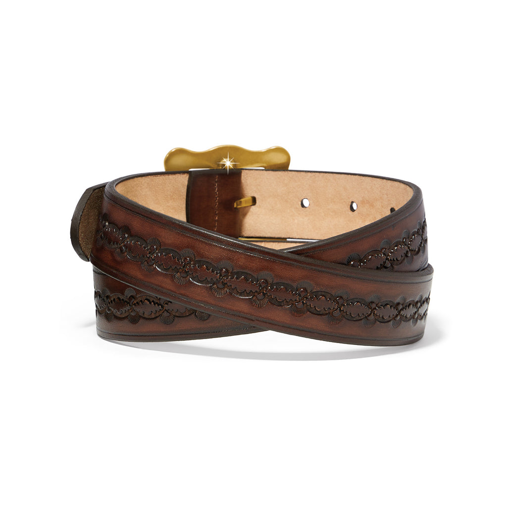 Belts are definitely having a fashion moment, and this fine leather belt with artisan embossing and a golden scalloped buckle is sure to tie your looks together whether you are wearing jeans, skirts or dresses.